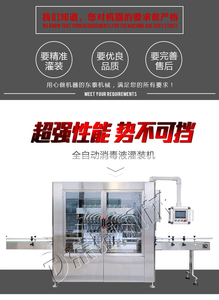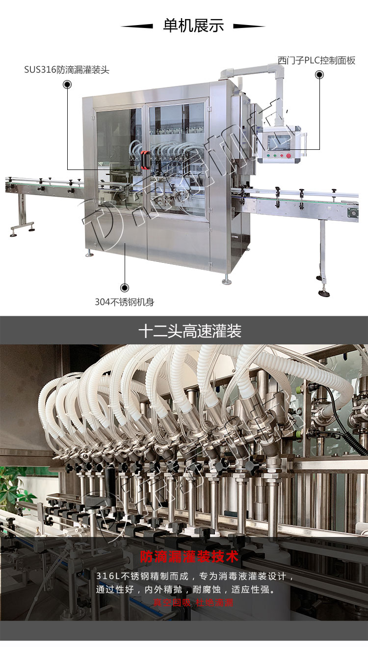 我們東泰機械憑著創(chuàng)新的產(chǎn)品理念和近乎苛刻的品質(zhì)標準設(shè)計的溶液全自動灌裝機,在激烈的灌裝機市場競爭中脫穎而出,這款溶液全自動灌裝機采用氣動元件均使用臺灣AIRTAC公司的產(chǎn)品,主要電器元件為日本和國產(chǎn)出色產(chǎn)品,故障率低,質(zhì)量,穩(wěn)定耐用,由可編程控制器(PLC)配合智能觸摸屏(人機界面)控制,人性化的設(shè)計使調(diào)整灌裝量及修改各種參數(shù)等操作均十分簡單、快捷、直觀,機身、機架由出色不銹鋼制成,物料桶到灌裝頭使用食品級塑料管連接,符合食品衛(wèi)生要求,整機設(shè)計簡潔大方,清洗方便,灌裝量調(diào)整方便,不需更換零配件,即可適用于不同規(guī)格的瓶子,調(diào)整方便,適應(yīng)性強也更是具有無瓶不灌裝、自動進瓶出瓶、自動定位灌裝、自動控制液位等功能,自動化程度高;灌裝嘴設(shè)計科學(xué)合理,配防滴漏裝置,灌裝不滴漏,擁有物料瓶及設(shè)備的干凈衛(wèi)生。是消毒液溶液生產(chǎn)廠家理想的溶液全自動灌裝機。