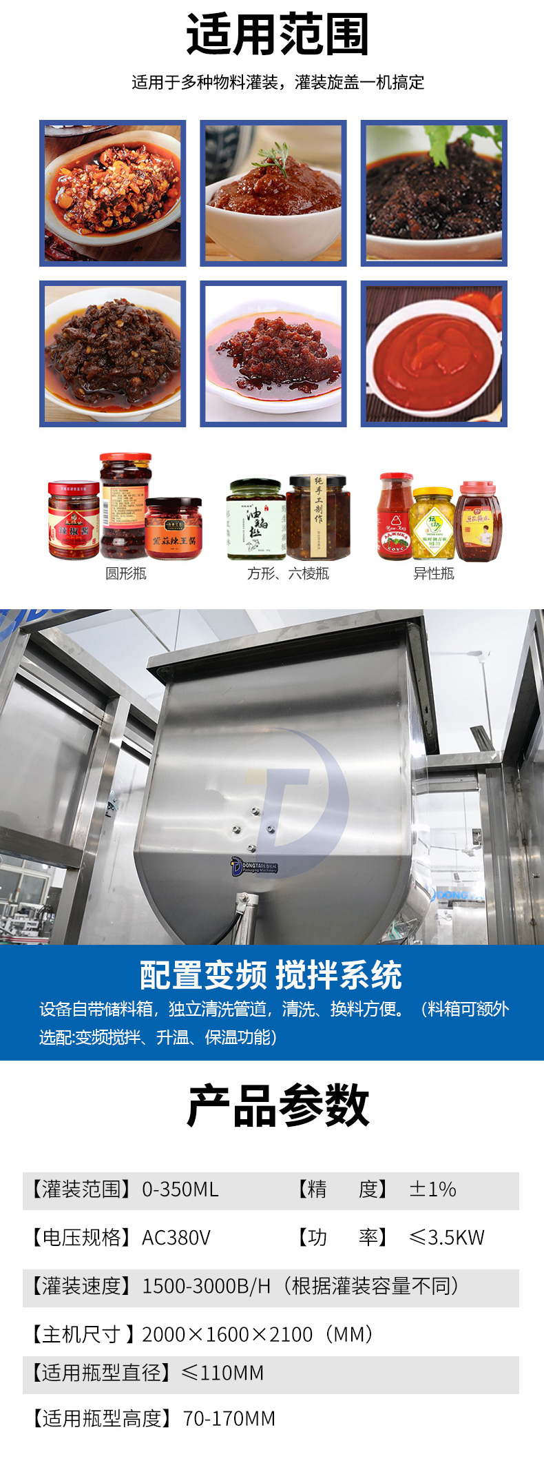在現(xiàn)如今的市場中,我們可以見到多種多樣的醬料商品不斷地出現(xiàn)再市場中,這就造成了醬料灌裝機的種類再不斷地增多。而蒜蓉醬灌裝機因其可以包裝大顆粒的蒜蓉而出名,而他再那樣的市場中發(fā)展依靠的不僅是作用,也是由于他的層次性和技術(shù)服務(wù)。大家都知道油料灌裝機是單獨的只可以包裝辣椒油、清油、紅油等無顆粒的油類商品,而蒜蓉醬灌裝機的使用則不僅是使用在蒜蓉醬的制造中,也是可以應(yīng)對各種香菇醬、芝麻醬、豆瓣醬、辣椒醬、青椒醬等多種多樣的醬料商品做好包裝,進而為各種醬料商品產(chǎn)生更合適的包裝。
