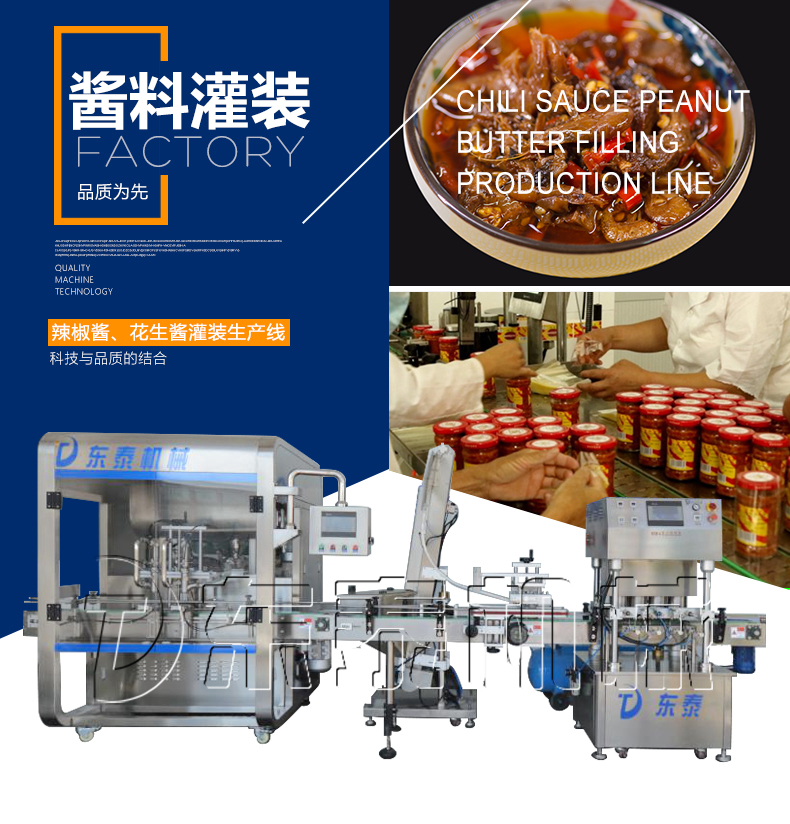 該辣椒醬灌裝生產(chǎn)線適合中小口徑三旋、四旋玻璃瓶調(diào)味醬的分裝,適合醬料、含顆粒黏稠物料的灌裝,物料接觸部分均采用316不銹鋼,整機(jī)304不銹鋼,符合食品衛(wèi)生標(biāo)準(zhǔn)。該機(jī)設(shè)計合理,機(jī)型小巧,立式結(jié)構(gòu),節(jié)省場地,操作方便。啟動部分均采用德國FESTO和臺灣AirTack的氣動元件。灌裝閥有氣動閥控制,灌裝精度更高,灌裝量和灌裝速度均可任意調(diào)整,灌裝悶頭采用防拉絲及升降灌裝裝置。