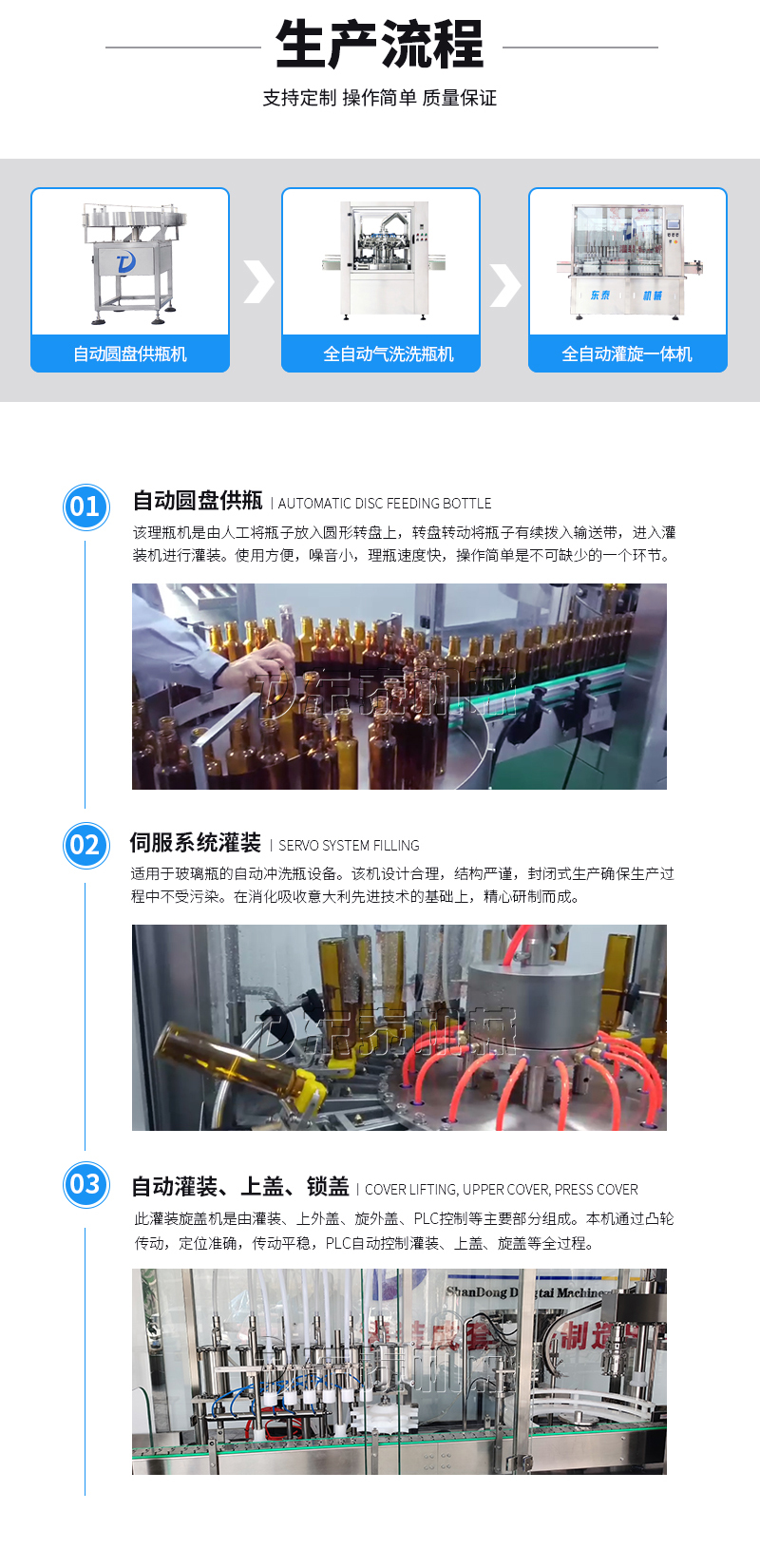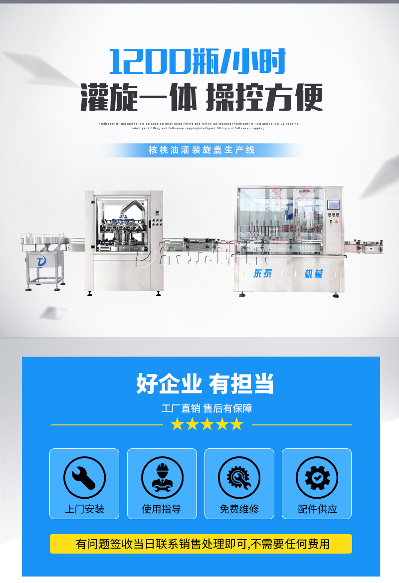?此灌裝旋蓋機(jī)是由灌裝、上外蓋、旋外蓋、PLC控制等主要部分組成。本機(jī)通過凸輪傳動(dòng),定位準(zhǔn)確,傳動(dòng)平穩(wěn),PLC自動(dòng)控制灌裝、上蓋、旋蓋等全過程。并可配置全自動(dòng)注塑機(jī),由吹瓶直接進(jìn)入灌裝系統(tǒng),防止交叉感染,整個(gè)過程全部在無菌條件下完成,無需洗瓶和烘干。此灌裝旋蓋機(jī)適合于食用油、藥品等粘流體的灌裝生產(chǎn)。