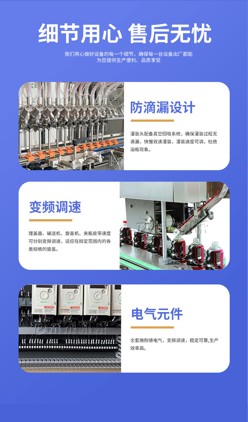 3.灌裝閥采用優(yōu)質(zhì)灌裝閥,下料速度快,灌裝量精準(zhǔn),且無(wú)滴漏現(xiàn)象產(chǎn)生。